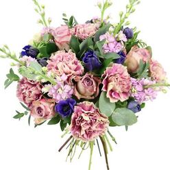 This dazzling bouquet is crafted with Walworth's signature flair, blending vibrant colour and tactile beauty in every bloom for occasions big and small. The centrepiece is a cascade of luxurious hydrangeas, their petals layered in indigo, teal, and muted purple-a palette echoing the lively tones of East Street's flower stalls. Interspersed are roses in the palest lavender and creamy white, gently spiralling outward, their quiet elegance elevated by the plush, rounded blossoms of white ranunculus. Delicate eustoma, in soft yellow hues, peek between the larger flowers, bringing in a subtle luminosity that invokes early spring. Vivid fuchsia sprays slip through the arrangement like flashes of colour in a Walworth evening market, balanced by feathery, barely-there pink astilbe along the fringe. Threaded light green and white filigree filler blossoms provide extra depth and complexity, reminiscent of neighbourhood gardens in full bloom. Deep green leaves cushion and support the lavish array, and the bouquet's base is tied together with a smooth, broad royal purple ribbon, its gloss echoing the bouquet's rich undertones. Bursting with texture and colour, this arrangement is perfect for marking birthdays, heartfelt milestones, or as an uplifting centrepiece gracing a Walworth kitchen table, available for same-day delivery throughout the area.