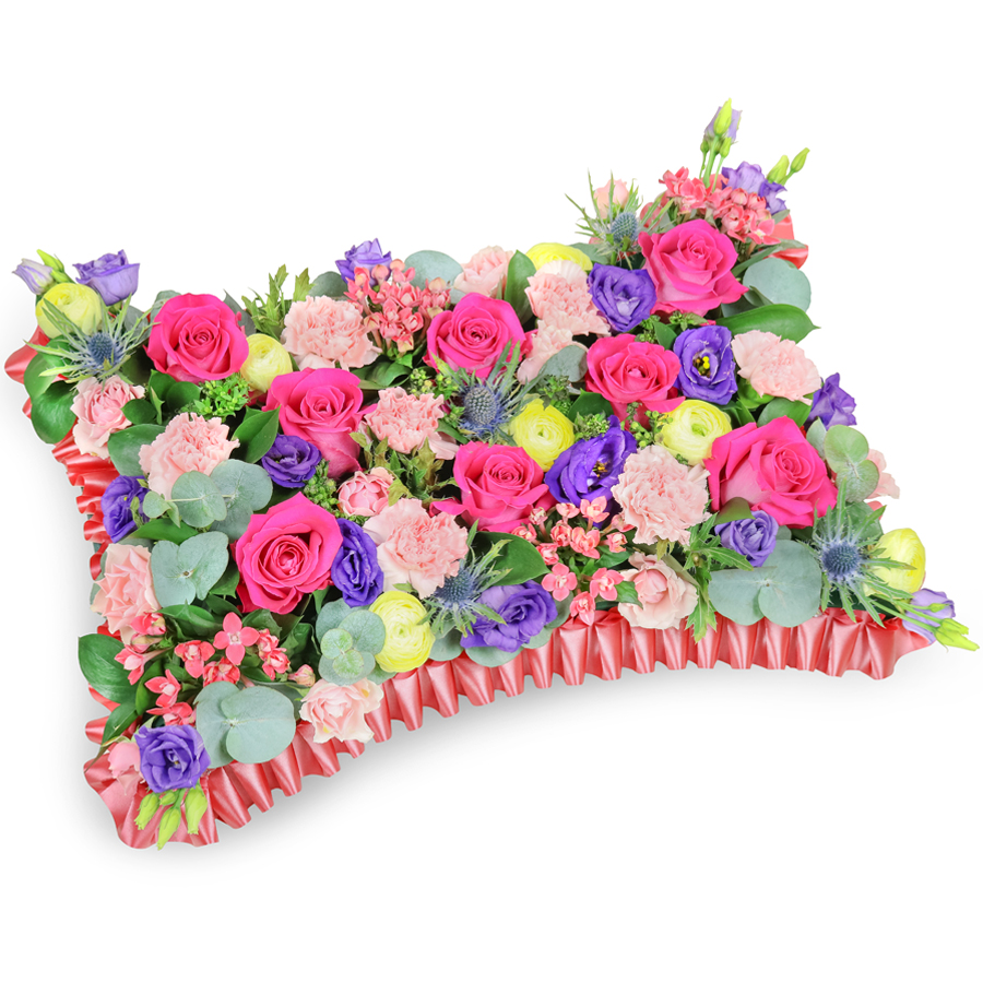 Celebrate life's precious moments with our charming pillow-shaped bouquet, featuring a stunning mix of roses, carnations, ranunculus, lisianthus, and bouvardia, complemented by lush eucalyptus and ruscus greenery.